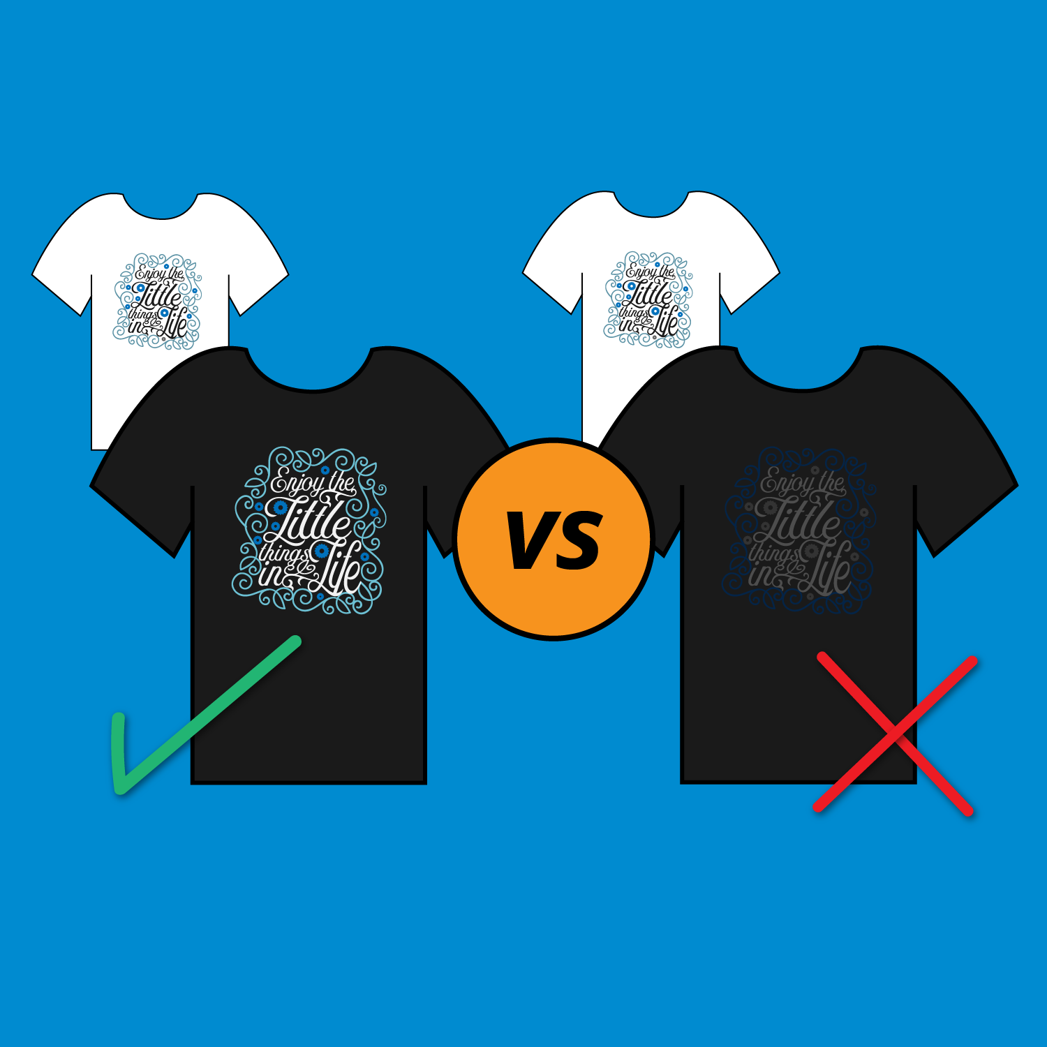 Contrast is the visual difference between the darker and lighter part of your design. An eye catching image with highly saturated colours will really stand out on a neutral background or shirt. Typical contrast mistakes are: Navy Blue on a Black shirt, Light Grey on Athletic Heather shirts, and Light Grey on White shirts - these never show up as expected and sometimes look as if they weren’t even printed.